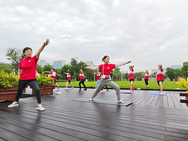 短暂休息后,捡跑队伍中的瑜伽教练“嘟嘟”,将大家引至公园一角被绿树与花草环绕的平台。在这里,一节与自然同频的户外瑜伽课悄然开启。“吸气,双臂向上延伸;呼气,身体缓慢前屈……”跟随“嘟嘟”轻柔的口令,志愿者们舒展肢体,深嗅草木清香,耳畔是鸟鸣婉转,仿佛身心正与这片绿意静静交融。