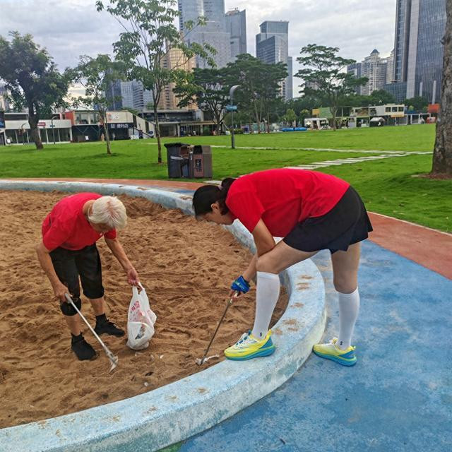 清晨6时,市民公园的蓝色步道上,陆续出现一个个红色的身影,他们手里拎着环保袋,脚步轻缓地掠过——时而俯身拾起滑梯下被遗忘的塑料碎片,时而小心捏出嵌在花坛边角的烟头,又将长椅底下悄悄“藏”着的零食包装轻轻收入袋中。一圈慢跑结束,手中的袋子渐渐鼓胀,而那些曾被垃圾点缀的角落,已悄然恢复清爽与宁静。
